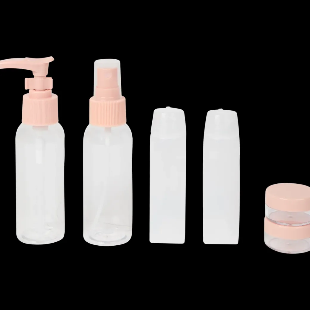 - Contient des flacons, des pots et un flacon à pompe à remplir en plastique